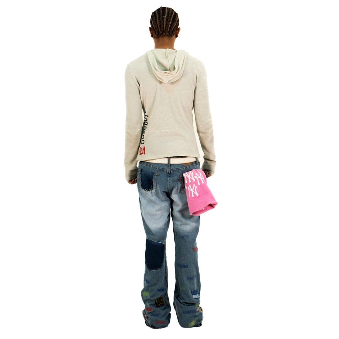 This bootcut flare jean is a unique piece, composed of several types of hand-stitched and machine-sewn details.